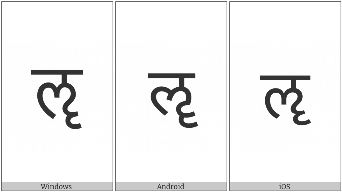 The image below shows how the “Devanagari Letter Vocalic Ll” symbol might look like on different operating systems. If the font in which this web site is displayed does not contain the symbol and there is no fallback font able to render it, you can use the image below to get an idea of what it should look like.