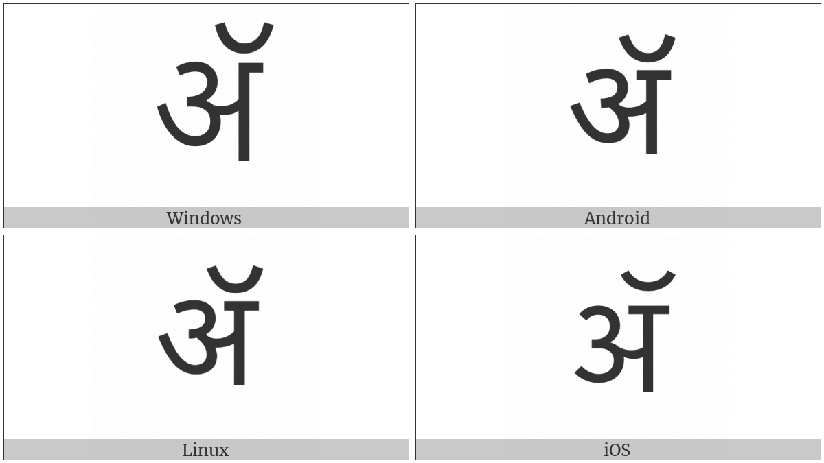 The image below shows how the “Devanagari Letter Candra A” symbol might look like on different operating systems. If the font in which this web site is displayed does not contain the symbol and there is no fallback font able to render it, you can use the image below to get an idea of what it should look like.