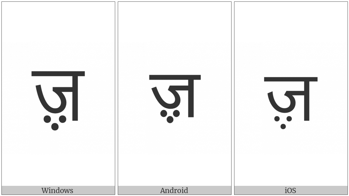The image below shows how the “Devanagari Letter Zha” symbol might look like on different operating systems. If the font in which this web site is displayed does not contain the symbol and there is no fallback font able to render it, you can use the image below to get an idea of what it should look like.