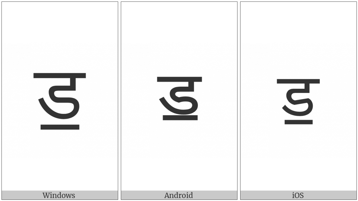 The image below shows how the “Devanagari Letter Ddda” symbol might look like on different operating systems. If the font in which this web site is displayed does not contain the symbol and there is no fallback font able to render it, you can use the image below to get an idea of what it should look like.