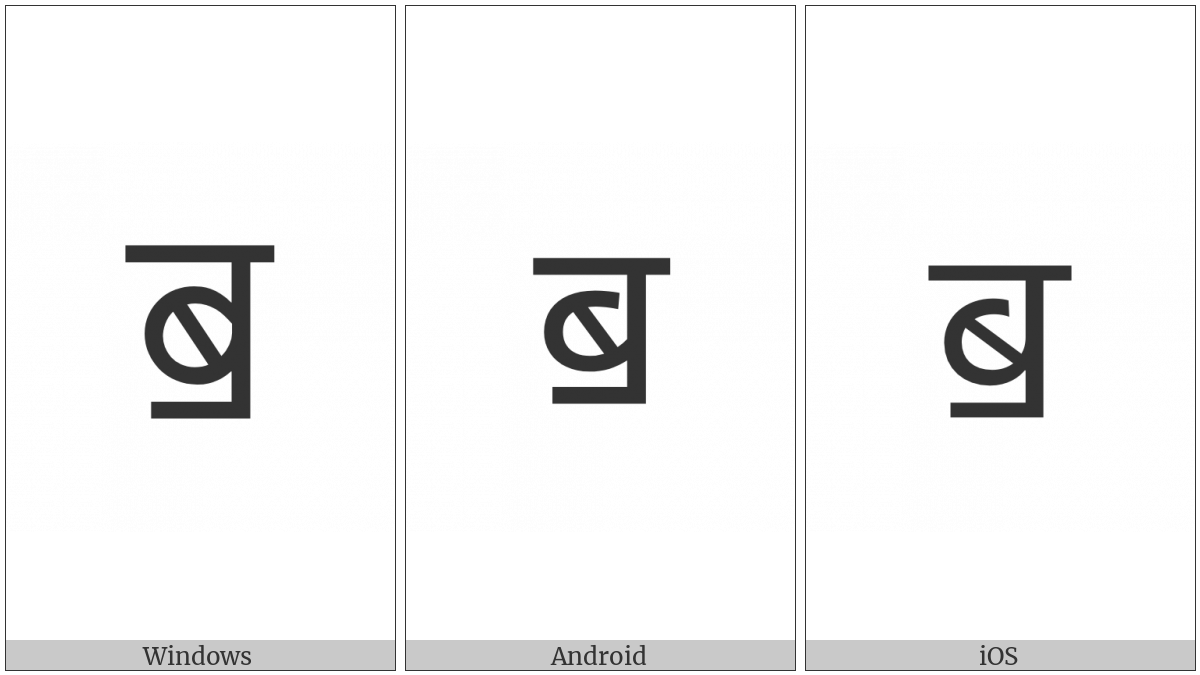 The image below shows how the “Devanagari Letter Bba” symbol might look like on different operating systems. If the font in which this web site is displayed does not contain the symbol and there is no fallback font able to render it, you can use the image below to get an idea of what it should look like.
