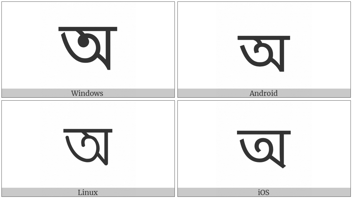 The image below shows how the “Bengali Letter A” symbol might look like on different operating systems. If the font in which this web site is displayed does not contain the symbol and there is no fallback font able to render it, you can use the image below to get an idea of what it should look like.