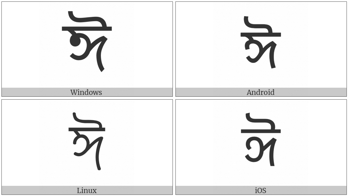 The image below shows how the “Bengali Letter Ii” symbol might look like on different operating systems. If the font in which this web site is displayed does not contain the symbol and there is no fallback font able to render it, you can use the image below to get an idea of what it should look like.