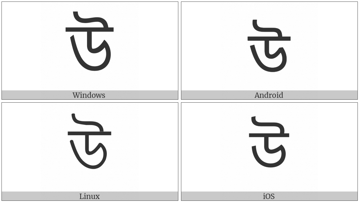 The image below shows how the “Bengali Letter U” symbol might look like on different operating systems. If the font in which this web site is displayed does not contain the symbol and there is no fallback font able to render it, you can use the image below to get an idea of what it should look like.