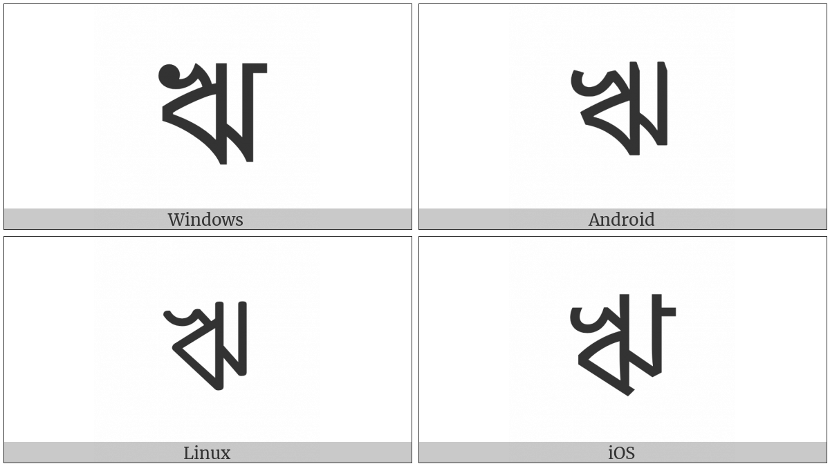 The image below shows how the “Bengali Letter Vocalic R” symbol might look like on different operating systems. If the font in which this web site is displayed does not contain the symbol and there is no fallback font able to render it, you can use the image below to get an idea of what it should look like.