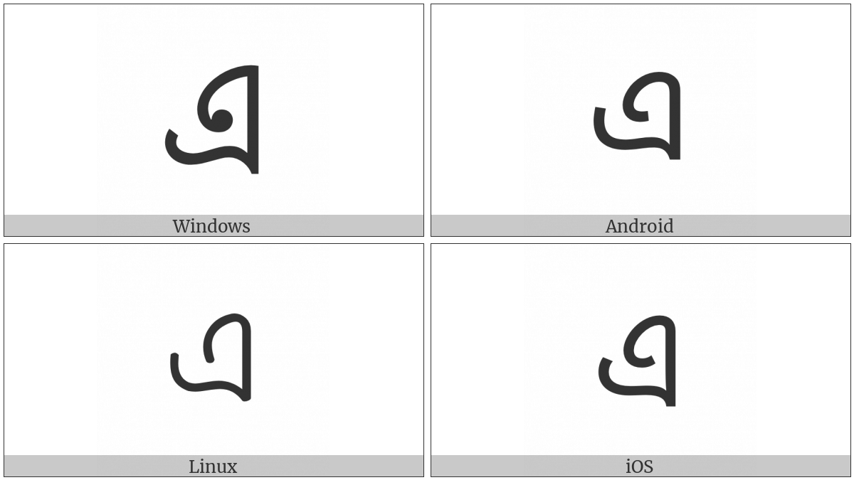 The image below shows how the “Bengali Letter E” symbol might look like on different operating systems. If the font in which this web site is displayed does not contain the symbol and there is no fallback font able to render it, you can use the image below to get an idea of what it should look like.