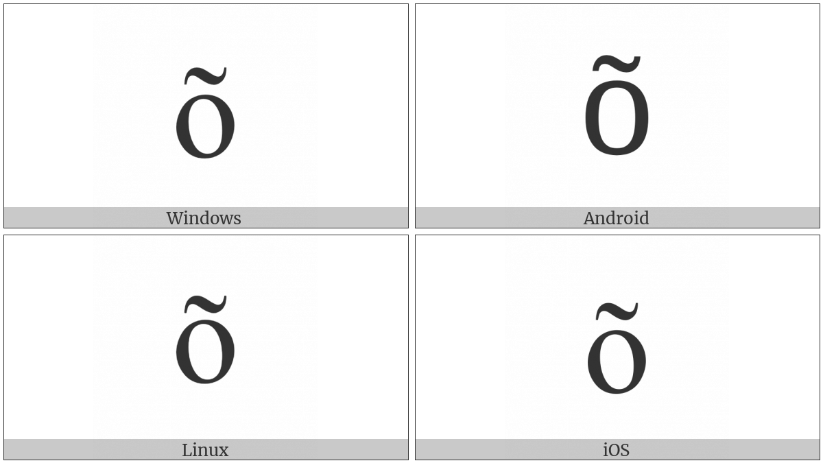 The image below shows how the “Latin Small Letter O With Tilde” symbol might look like on different operating systems. If the font in which this web site is displayed does not contain the symbol and there is no fallback font able to render it, you can use the image below to get an idea of what it should look like.