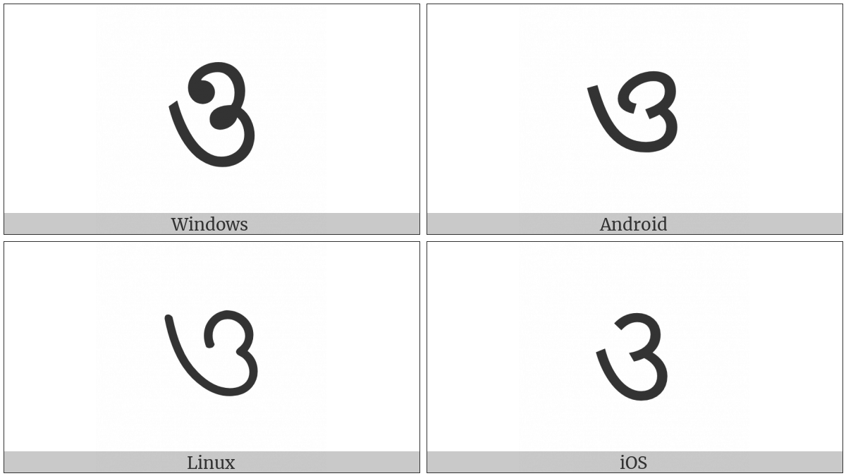 The image below shows how the “Bengali Letter O” symbol might look like on different operating systems. If the font in which this web site is displayed does not contain the symbol and there is no fallback font able to render it, you can use the image below to get an idea of what it should look like.
