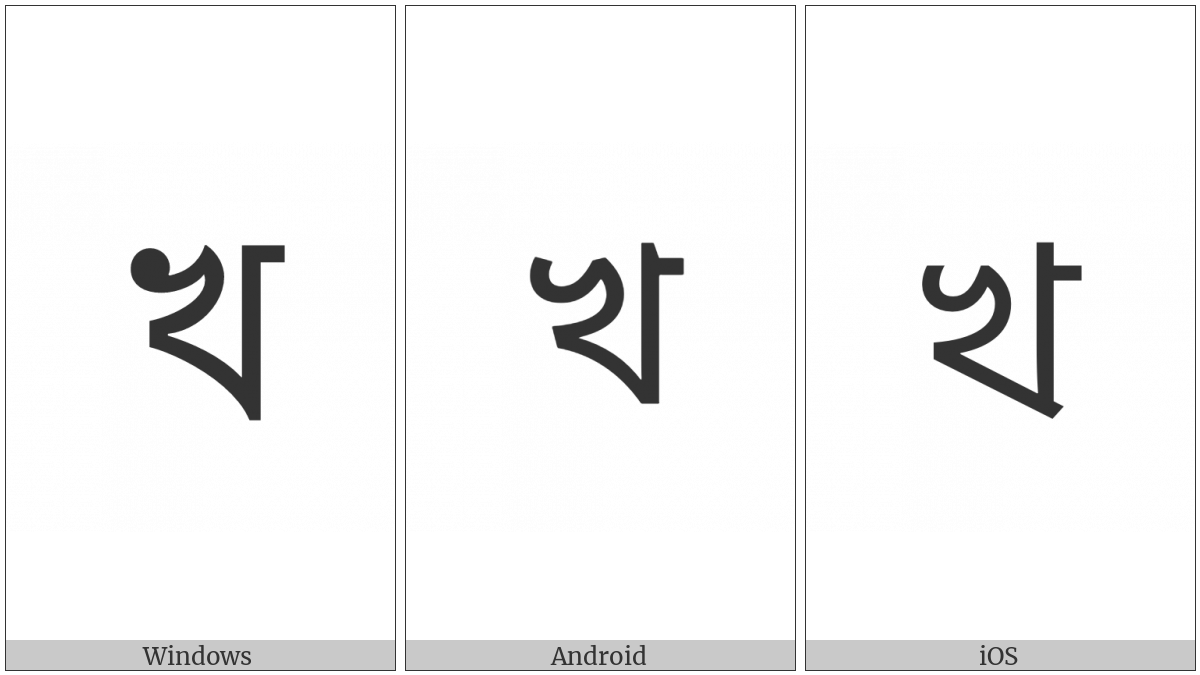 The image below shows how the “Bengali Letter Kha” symbol might look like on different operating systems. If the font in which this web site is displayed does not contain the symbol and there is no fallback font able to render it, you can use the image below to get an idea of what it should look like.