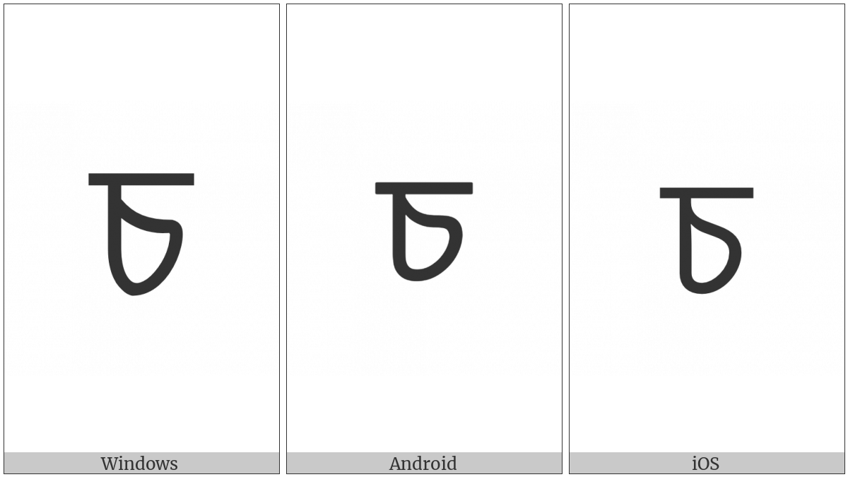 The image below shows how the “Bengali Letter Ca” symbol might look like on different operating systems. If the font in which this web site is displayed does not contain the symbol and there is no fallback font able to render it, you can use the image below to get an idea of what it should look like.