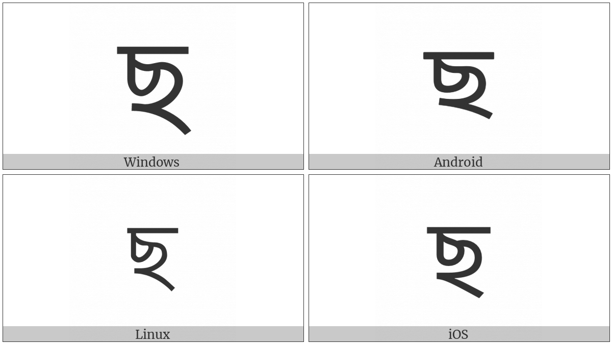 The image below shows how the “Bengali Letter Cha” symbol might look like on different operating systems. If the font in which this web site is displayed does not contain the symbol and there is no fallback font able to render it, you can use the image below to get an idea of what it should look like.