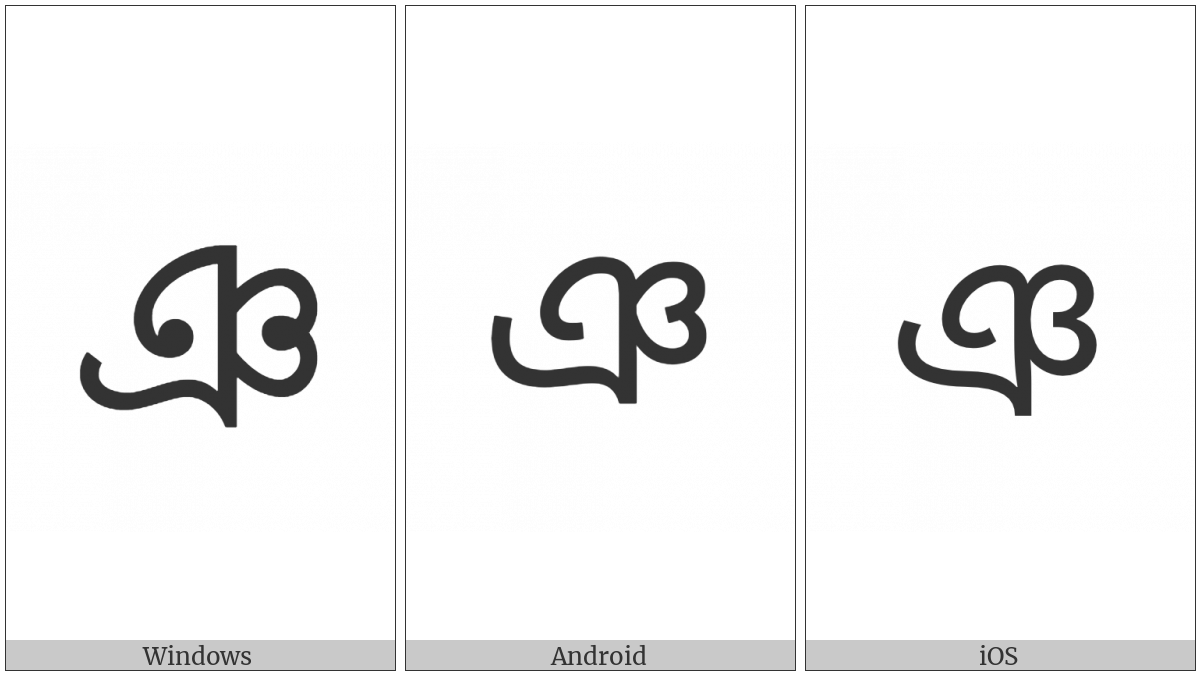 The image below shows how the “Bengali Letter Nya” symbol might look like on different operating systems. If the font in which this web site is displayed does not contain the symbol and there is no fallback font able to render it, you can use the image below to get an idea of what it should look like.