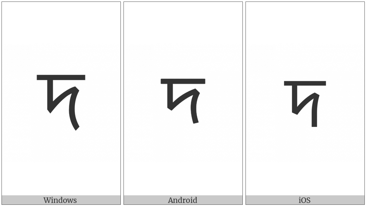 The image below shows how the “Bengali Letter Da” symbol might look like on different operating systems. If the font in which this web site is displayed does not contain the symbol and there is no fallback font able to render it, you can use the image below to get an idea of what it should look like.