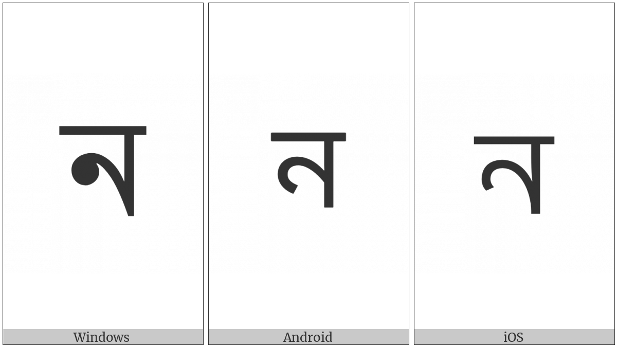 The image below shows how the “Bengali Letter Na” symbol might look like on different operating systems. If the font in which this web site is displayed does not contain the symbol and there is no fallback font able to render it, you can use the image below to get an idea of what it should look like.