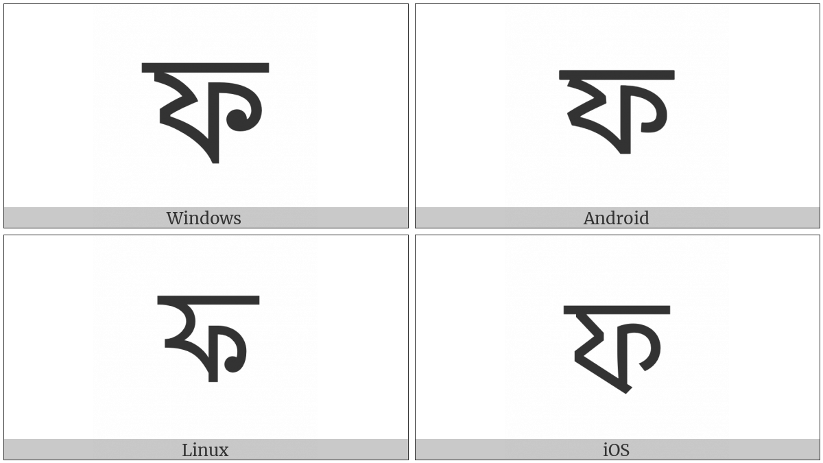 The image below shows how the “Bengali Letter Pha” symbol might look like on different operating systems. If the font in which this web site is displayed does not contain the symbol and there is no fallback font able to render it, you can use the image below to get an idea of what it should look like.