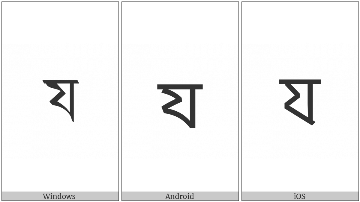 The image below shows how the “Bengali Letter Ya” symbol might look like on different operating systems. If the font in which this web site is displayed does not contain the symbol and there is no fallback font able to render it, you can use the image below to get an idea of what it should look like.