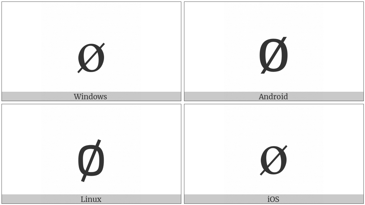 The image below shows how the “Latin Small Letter O With Stroke” symbol might look like on different operating systems. If the font in which this web site is displayed does not contain the symbol and there is no fallback font able to render it, you can use the image below to get an idea of what it should look like.