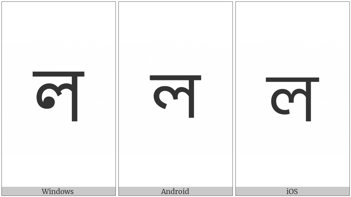 The image below shows how the “Bengali Letter La” symbol might look like on different operating systems. If the font in which this web site is displayed does not contain the symbol and there is no fallback font able to render it, you can use the image below to get an idea of what it should look like.