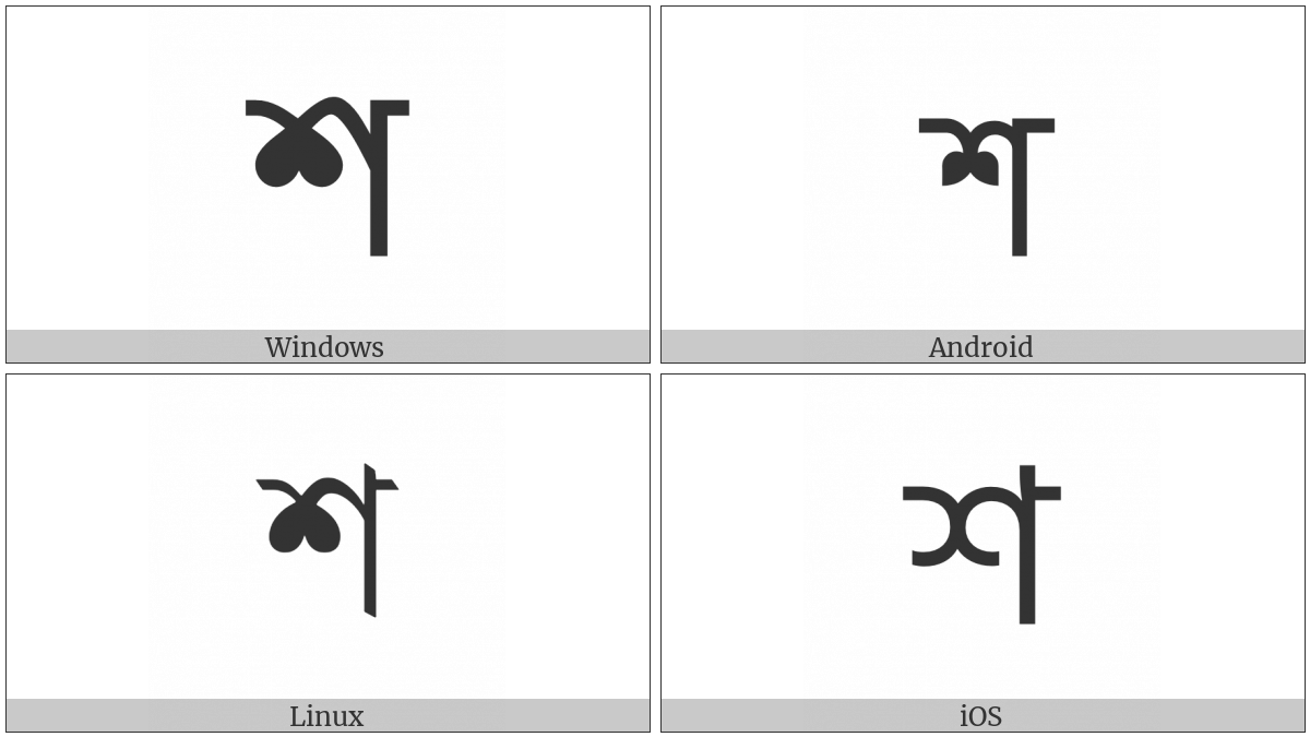 The image below shows how the “Bengali Letter Sha” symbol might look like on different operating systems. If the font in which this web site is displayed does not contain the symbol and there is no fallback font able to render it, you can use the image below to get an idea of what it should look like.