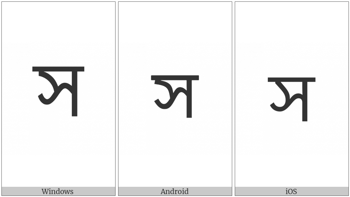 The image below shows how the “Bengali Letter Sa” symbol might look like on different operating systems. If the font in which this web site is displayed does not contain the symbol and there is no fallback font able to render it, you can use the image below to get an idea of what it should look like.