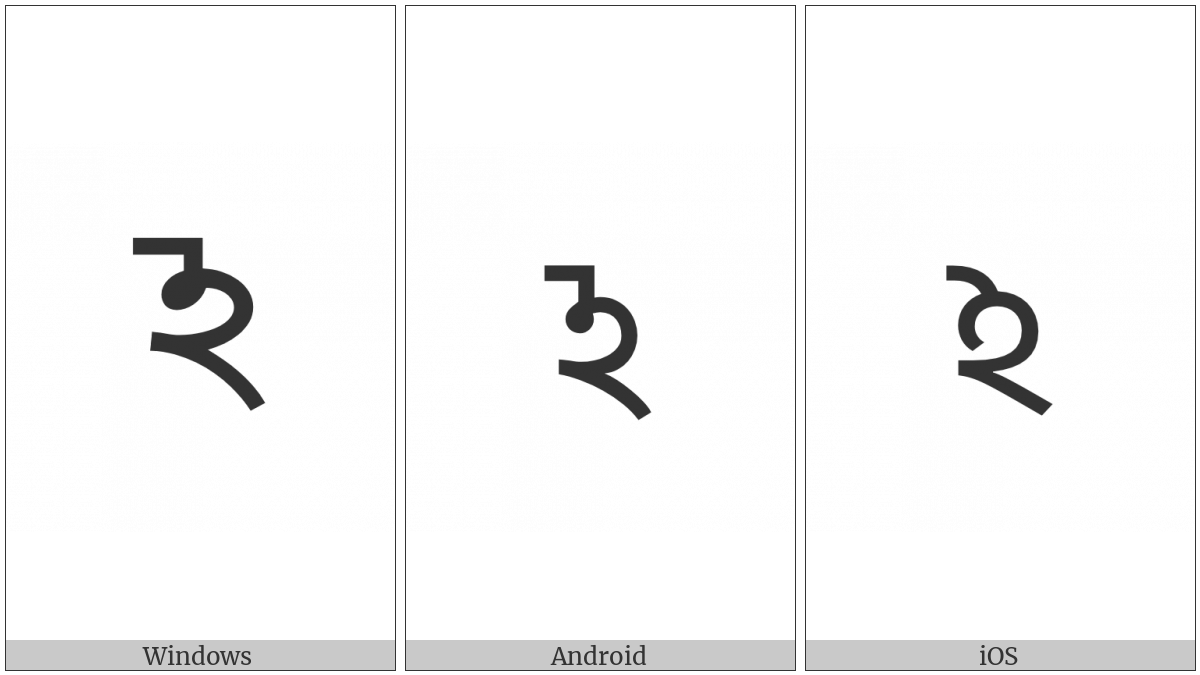 The image below shows how the “Bengali Sign Avagraha” symbol might look like on different operating systems. If the font in which this web site is displayed does not contain the symbol and there is no fallback font able to render it, you can use the image below to get an idea of what it should look like.