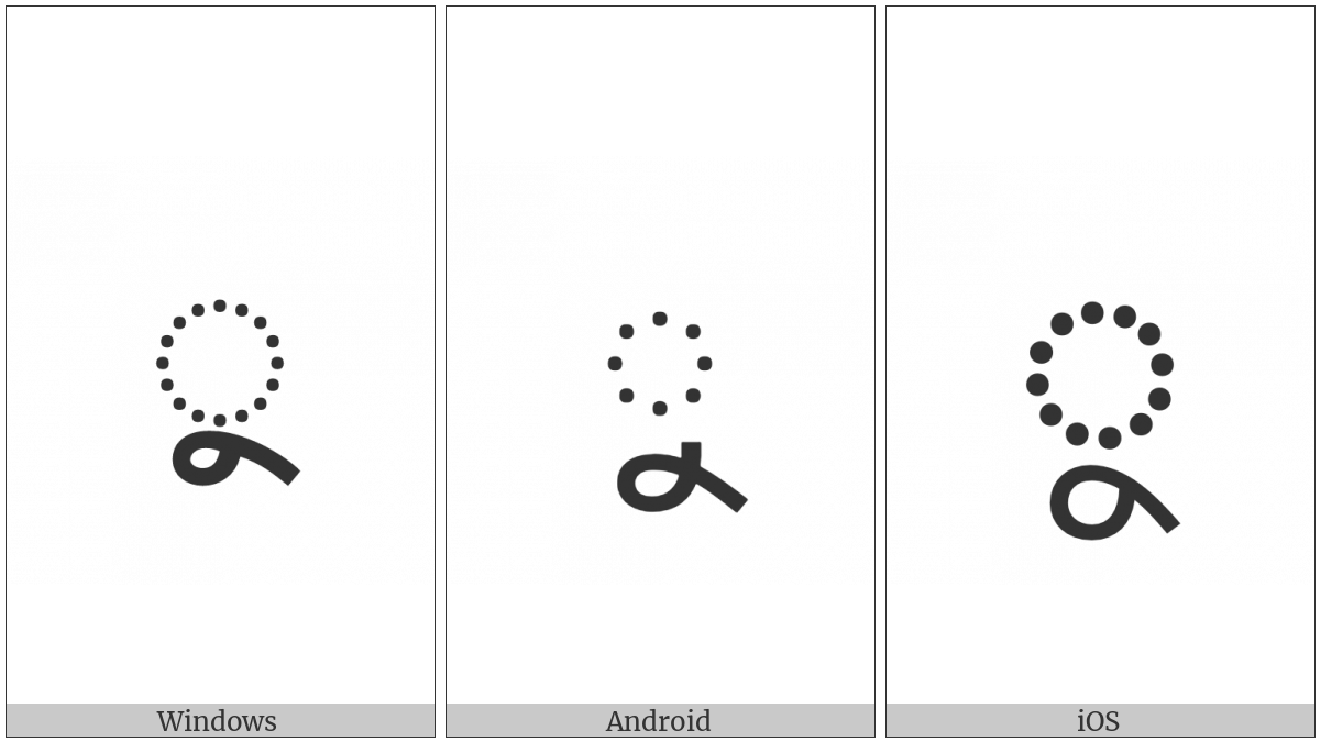 The image below shows how the “Bengali Vowel Sign U” symbol might look like on different operating systems. If the font in which this web site is displayed does not contain the symbol and there is no fallback font able to render it, you can use the image below to get an idea of what it should look like.