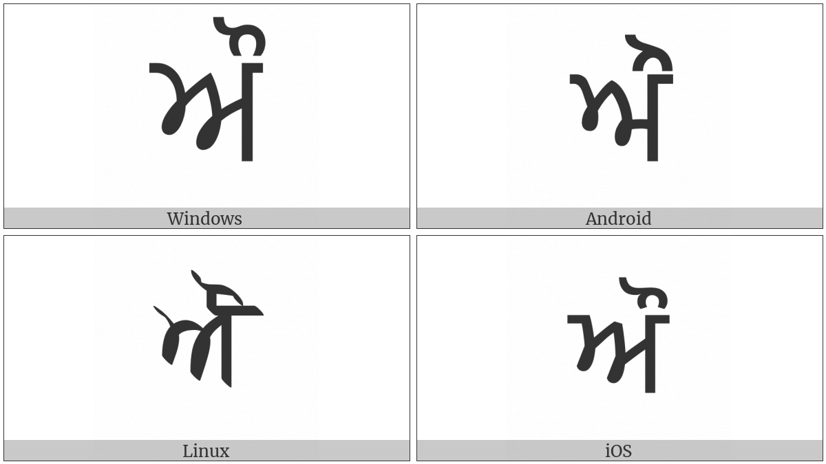 The image below shows how the “Gurmukhi Letter Au” symbol might look like on different operating systems. If the font in which this web site is displayed does not contain the symbol and there is no fallback font able to render it, you can use the image below to get an idea of what it should look like.