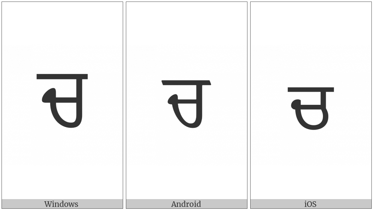 The image below shows how the “Gurmukhi Letter Ca” symbol might look like on different operating systems. If the font in which this web site is displayed does not contain the symbol and there is no fallback font able to render it, you can use the image below to get an idea of what it should look like.