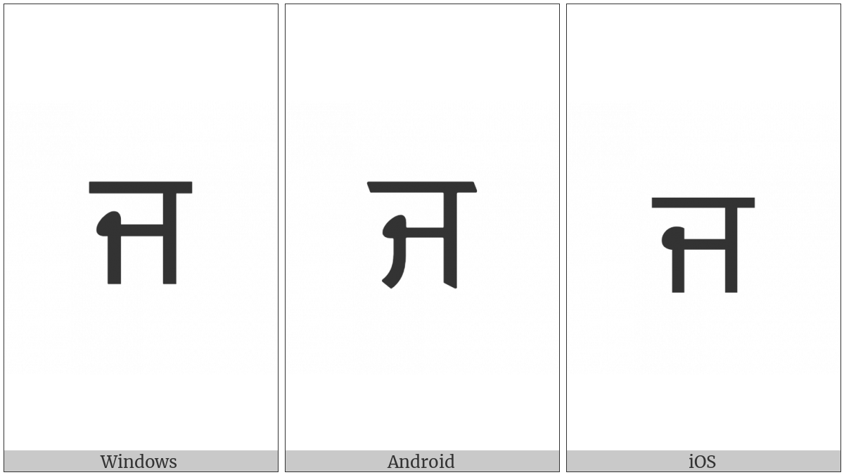 The image below shows how the “Gurmukhi Letter Ja” symbol might look like on different operating systems. If the font in which this web site is displayed does not contain the symbol and there is no fallback font able to render it, you can use the image below to get an idea of what it should look like.