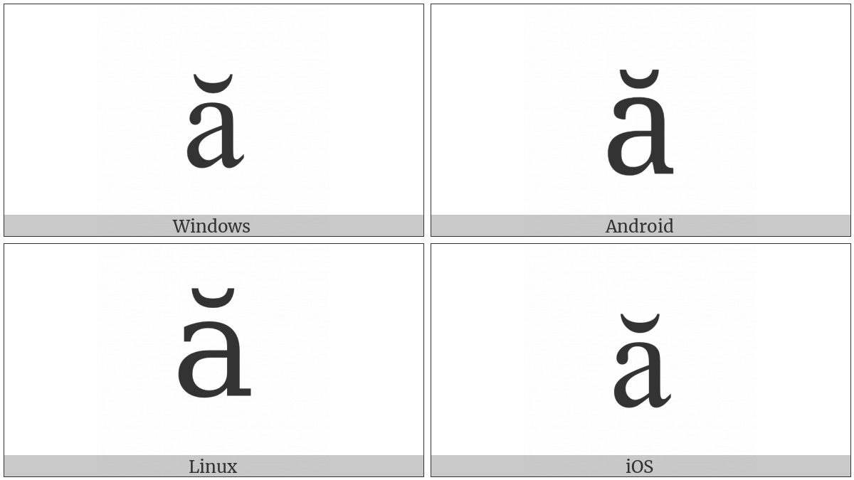 The image below shows how the “Latin Small Letter A With Breve” symbol might look like on different operating systems. If the font in which this web site is displayed does not contain the symbol and there is no fallback font able to render it, you can use the image below to get an idea of what it should look like.