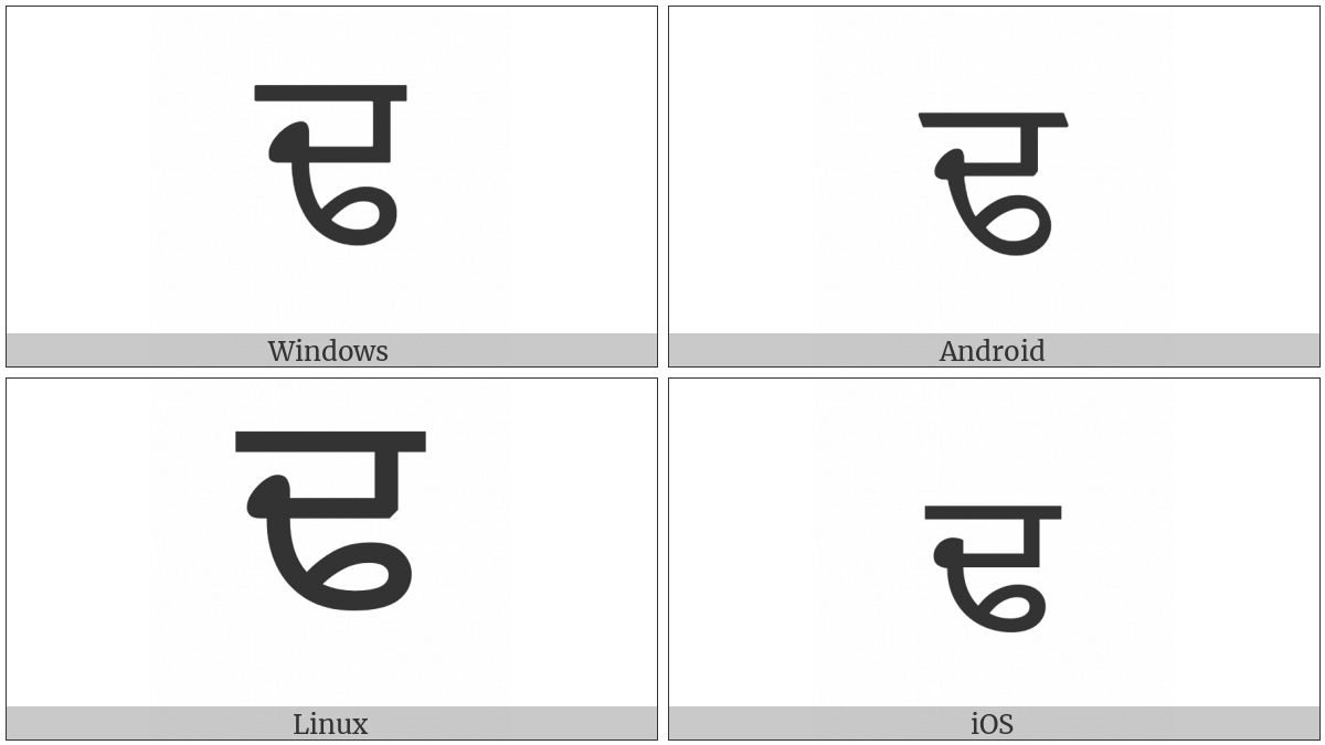 The image below shows how the “Gurmukhi Letter Ddha” symbol might look like on different operating systems. If the font in which this web site is displayed does not contain the symbol and there is no fallback font able to render it, you can use the image below to get an idea of what it should look like.