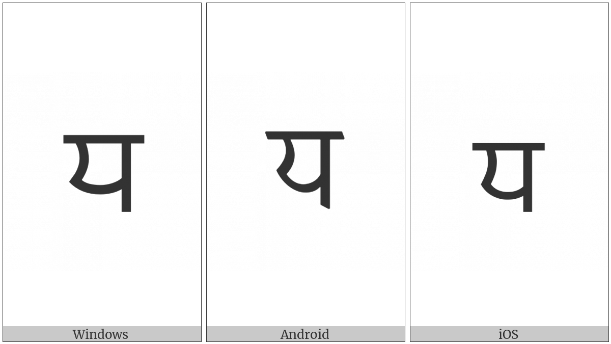 The image below shows how the “Gurmukhi Letter Dha” symbol might look like on different operating systems. If the font in which this web site is displayed does not contain the symbol and there is no fallback font able to render it, you can use the image below to get an idea of what it should look like.