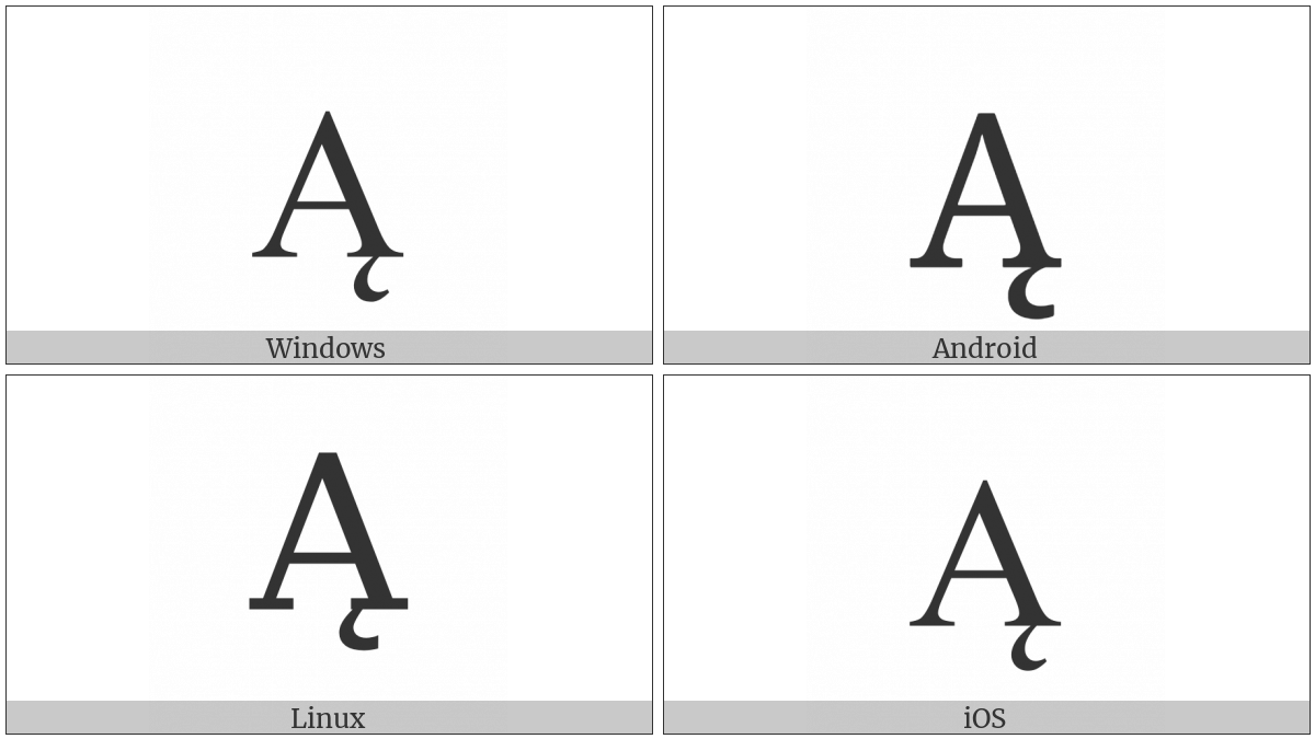 The image below shows how the “Latin Capital Letter A With Ogonek” symbol might look like on different operating systems. If the font in which this web site is displayed does not contain the symbol and there is no fallback font able to render it, you can use the image below to get an idea of what it should look like.