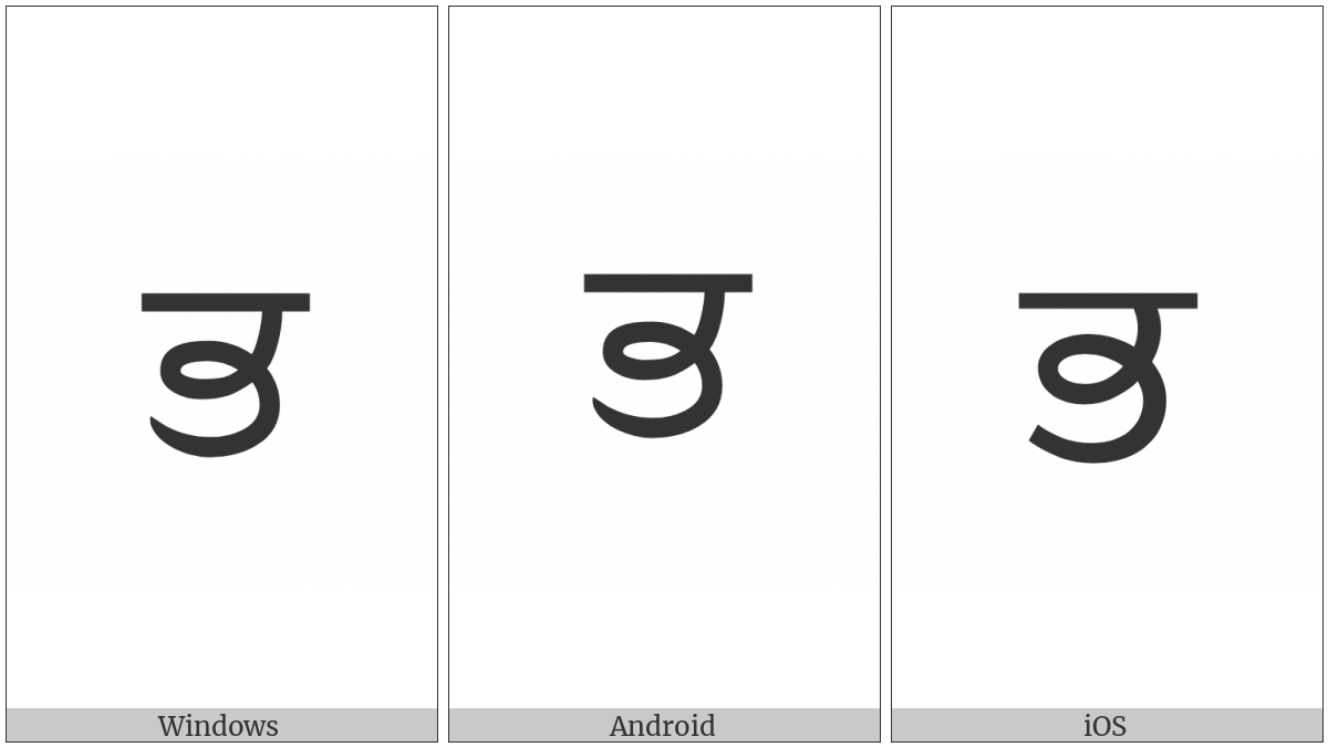 The image below shows how the “Gurmukhi Letter Bha” symbol might look like on different operating systems. If the font in which this web site is displayed does not contain the symbol and there is no fallback font able to render it, you can use the image below to get an idea of what it should look like.