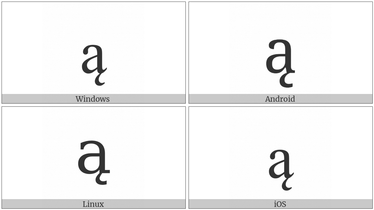 The image below shows how the “Latin Small Letter A With Ogonek” symbol might look like on different operating systems. If the font in which this web site is displayed does not contain the symbol and there is no fallback font able to render it, you can use the image below to get an idea of what it should look like.