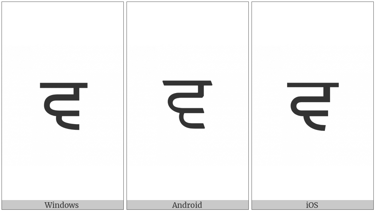 The image below shows how the “Gurmukhi Letter Va” symbol might look like on different operating systems. If the font in which this web site is displayed does not contain the symbol and there is no fallback font able to render it, you can use the image below to get an idea of what it should look like.