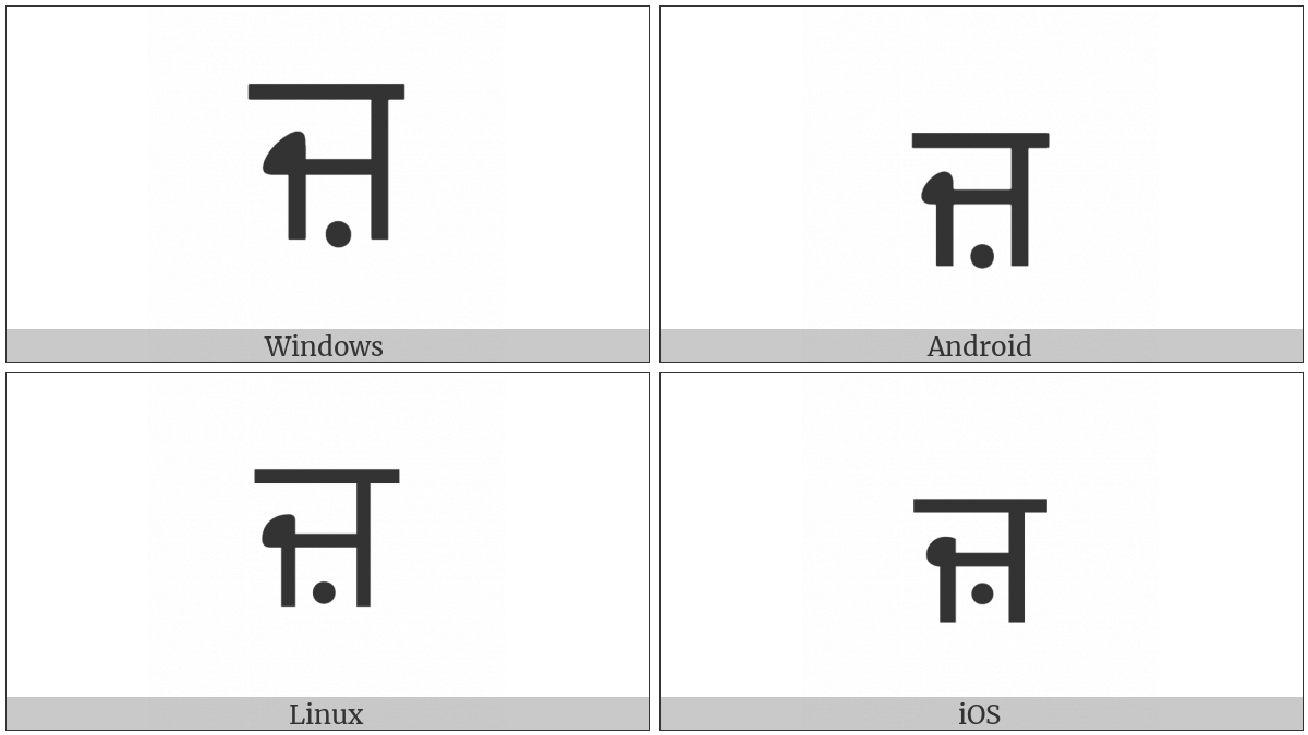 The image below shows how the “Gurmukhi Letter Za” symbol might look like on different operating systems. If the font in which this web site is displayed does not contain the symbol and there is no fallback font able to render it, you can use the image below to get an idea of what it should look like.