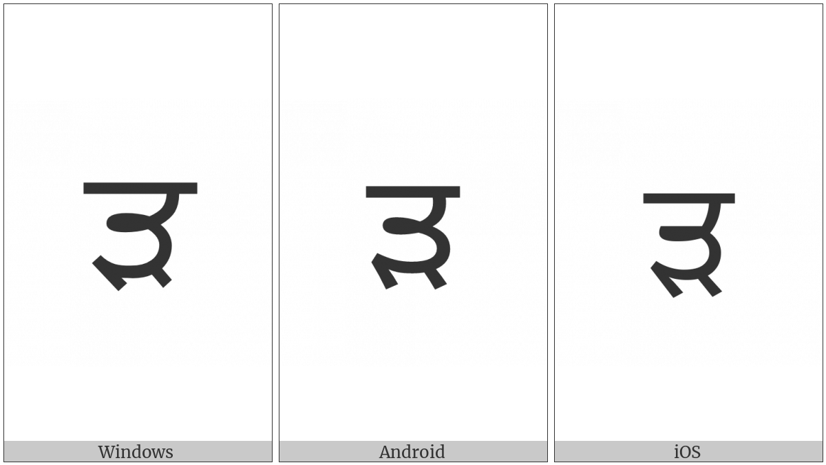 The image below shows how the “Gurmukhi Letter Rra” symbol might look like on different operating systems. If the font in which this web site is displayed does not contain the symbol and there is no fallback font able to render it, you can use the image below to get an idea of what it should look like.
