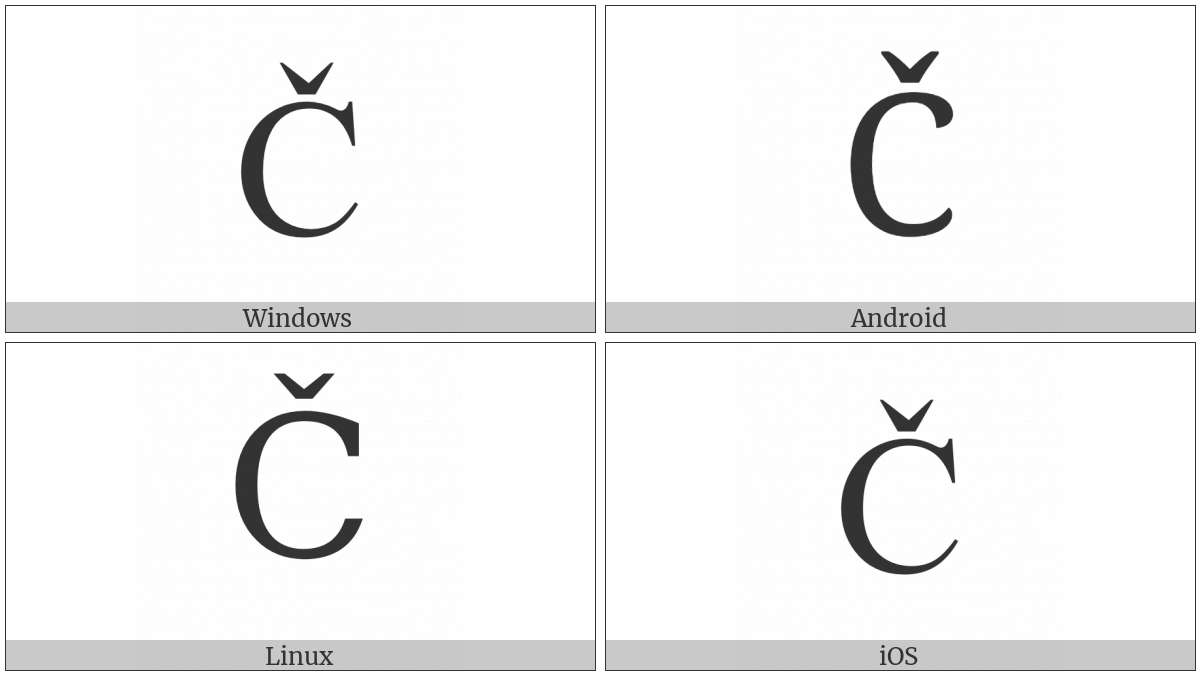 The image below shows how the “Latin Capital Letter C With Caron” symbol might look like on different operating systems. If the font in which this web site is displayed does not contain the symbol and there is no fallback font able to render it, you can use the image below to get an idea of what it should look like.