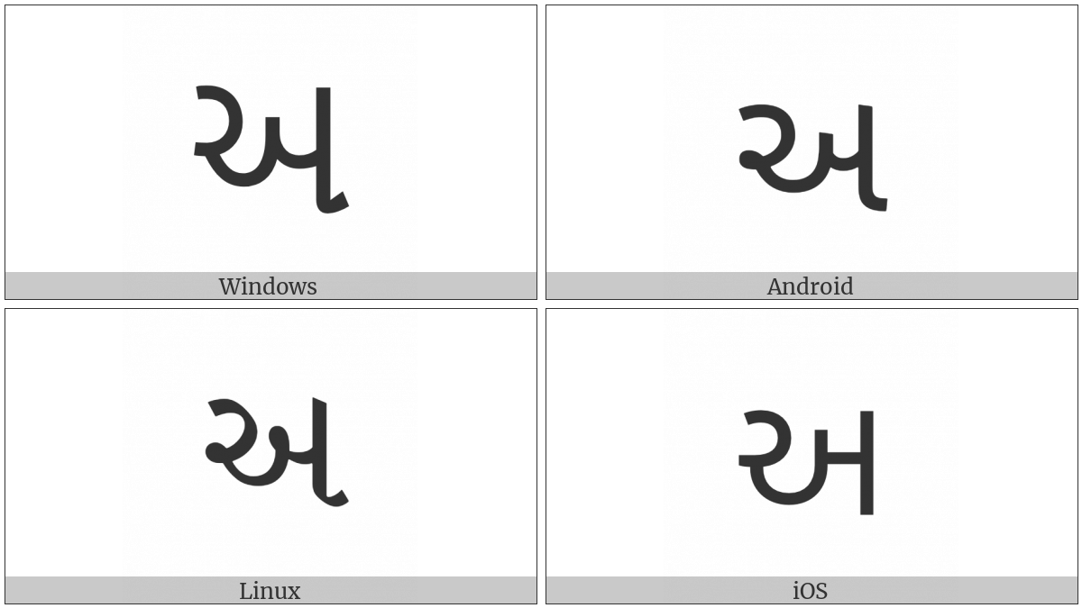 The image below shows how the “Gujarati Letter A” symbol might look like on different operating systems. If the font in which this web site is displayed does not contain the symbol and there is no fallback font able to render it, you can use the image below to get an idea of what it should look like.