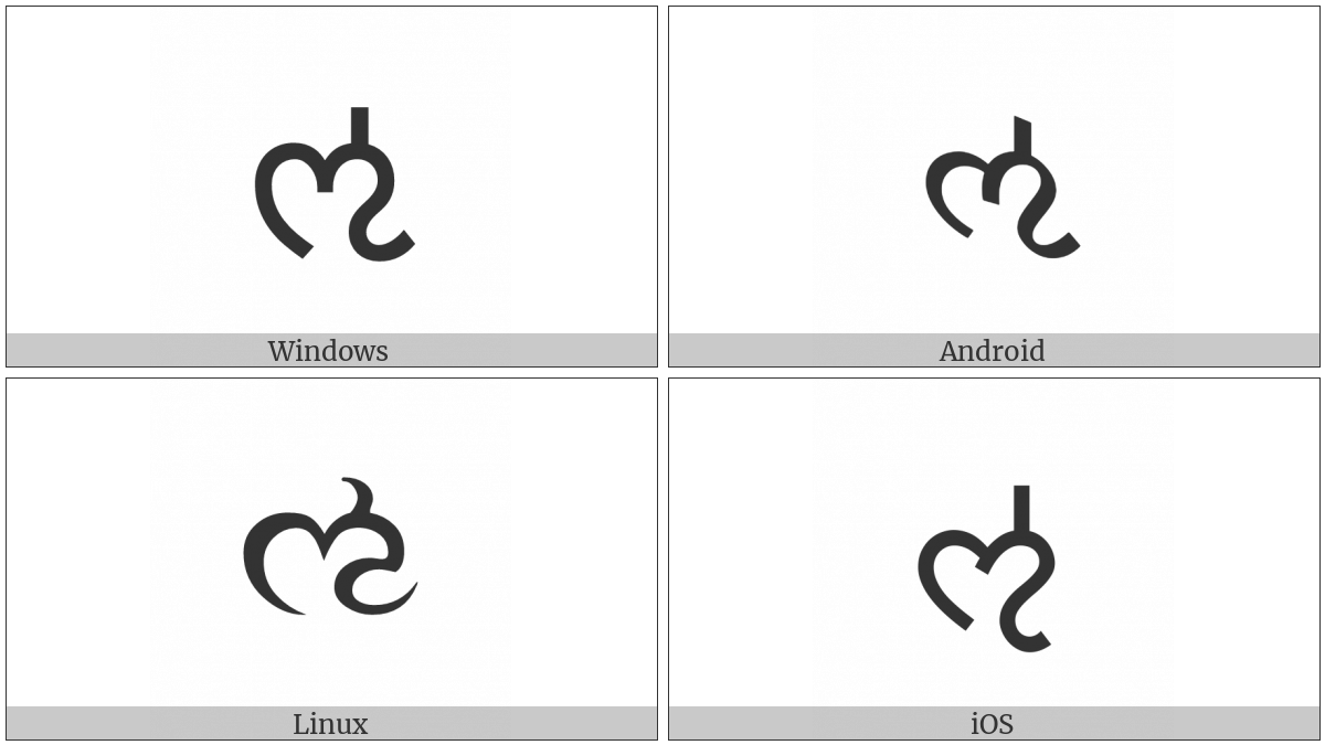 The image below shows how the “Gujarati Letter Vocalic L” symbol might look like on different operating systems. If the font in which this web site is displayed does not contain the symbol and there is no fallback font able to render it, you can use the image below to get an idea of what it should look like.