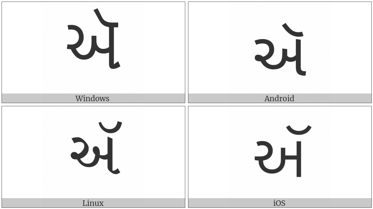 The image below shows how the “Gujarati Vowel Candra E” symbol might look like on different operating systems. If the font in which this web site is displayed does not contain the symbol and there is no fallback font able to render it, you can use the image below to get an idea of what it should look like.