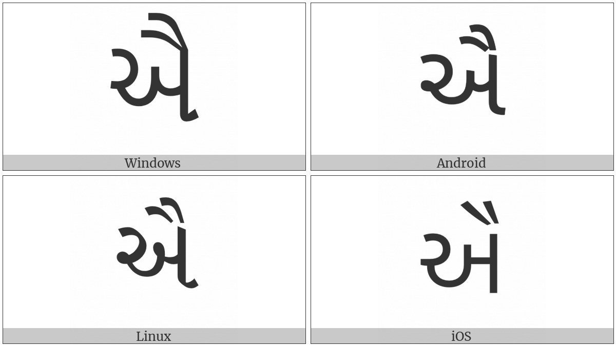 The image below shows how the “Gujarati Letter Ai” symbol might look like on different operating systems. If the font in which this web site is displayed does not contain the symbol and there is no fallback font able to render it, you can use the image below to get an idea of what it should look like.