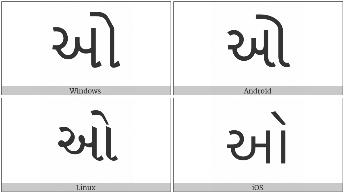 The image below shows how the “Gujarati Letter O” symbol might look like on different operating systems. If the font in which this web site is displayed does not contain the symbol and there is no fallback font able to render it, you can use the image below to get an idea of what it should look like.