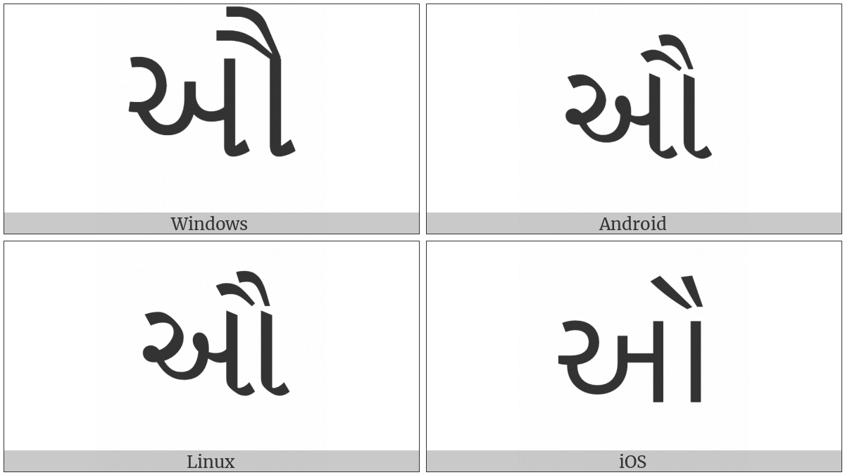The image below shows how the “Gujarati Letter Au” symbol might look like on different operating systems. If the font in which this web site is displayed does not contain the symbol and there is no fallback font able to render it, you can use the image below to get an idea of what it should look like.