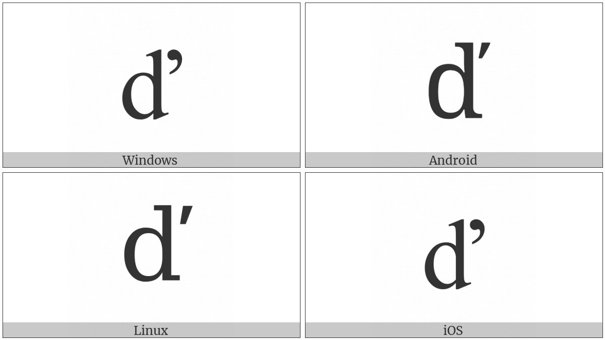 The image below shows how the “Latin Small Letter D With Caron” symbol might look like on different operating systems. If the font in which this web site is displayed does not contain the symbol and there is no fallback font able to render it, you can use the image below to get an idea of what it should look like.