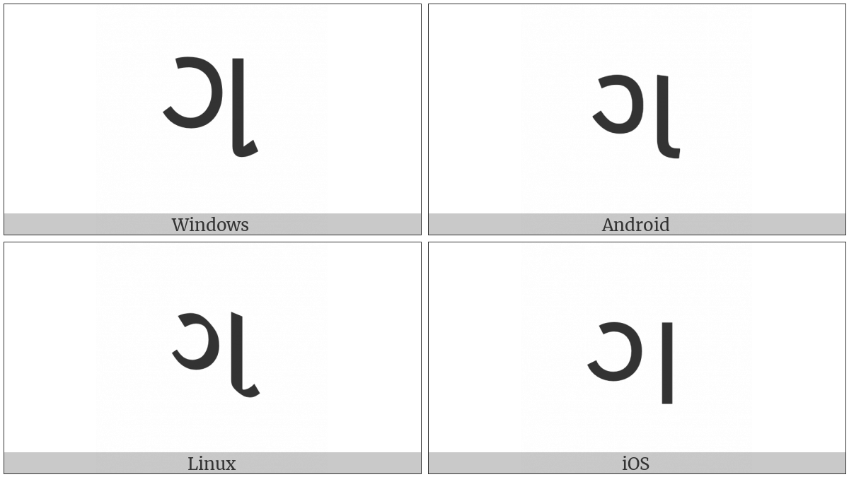The image below shows how the “Gujarati Letter Ga” symbol might look like on different operating systems. If the font in which this web site is displayed does not contain the symbol and there is no fallback font able to render it, you can use the image below to get an idea of what it should look like.