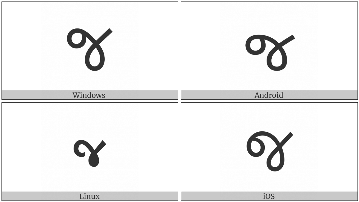 The image below shows how the “Gujarati Letter Ja” symbol might look like on different operating systems. If the font in which this web site is displayed does not contain the symbol and there is no fallback font able to render it, you can use the image below to get an idea of what it should look like.