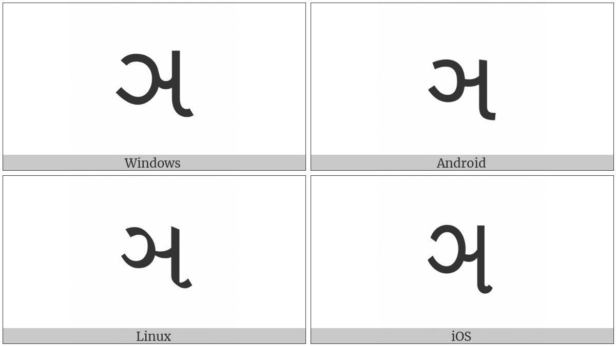 The image below shows how the “Gujarati Letter Nya” symbol might look like on different operating systems. If the font in which this web site is displayed does not contain the symbol and there is no fallback font able to render it, you can use the image below to get an idea of what it should look like.