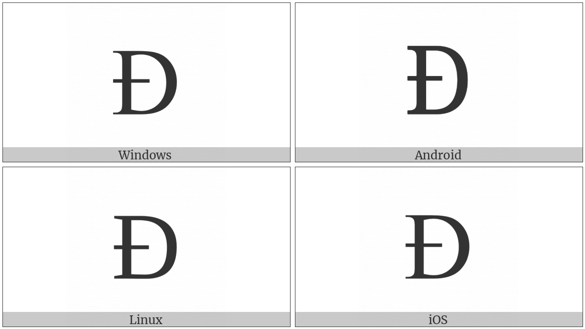 The image below shows how the “Latin Capital Letter D With Stroke” symbol might look like on different operating systems. If the font in which this web site is displayed does not contain the symbol and there is no fallback font able to render it, you can use the image below to get an idea of what it should look like.
